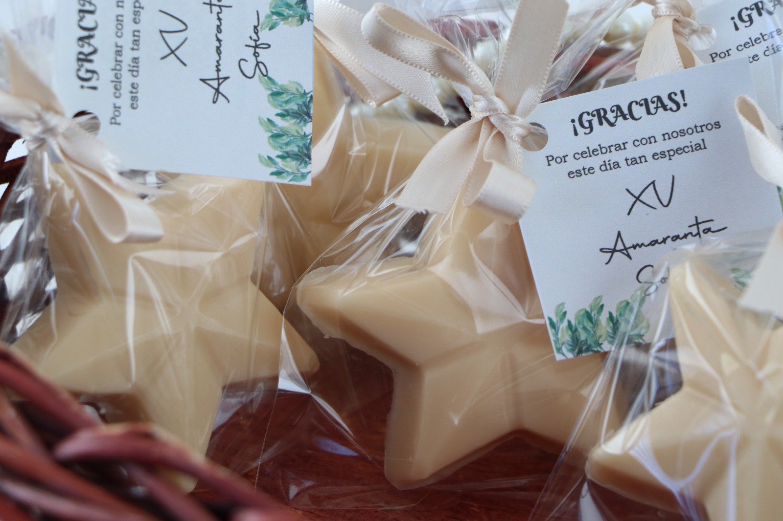 Estoy muy contenta con los recuerditos para mí hermana, los jaboncitos de rosas están muy bonitos con olor floral. Las etiquetas personalizadas, te dan a elegir como quieres que se envuelvan, yo elegí tul y listón beige.